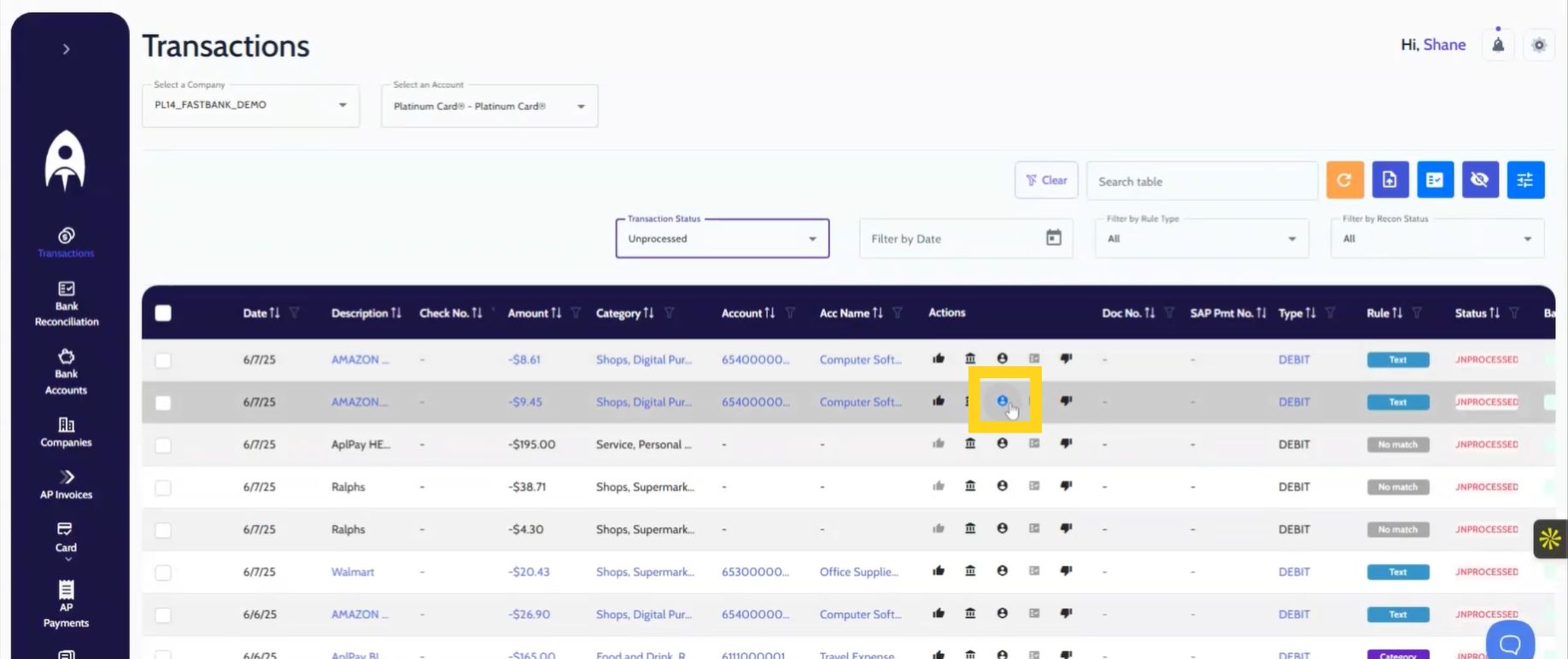 Under the same Actions tab, click the BP (Business Partner) icon for the transaction.